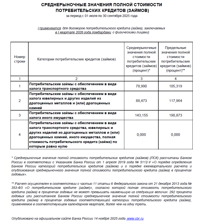 Банк России разместил на своем официальном сайте среднерыночные и предельные значения ПСК, которые будут применяться в первом квартале 2019 г. Предельное значение ПСК по потребительским займам с обеспечением в виде залога «иного имущества» (ювелирные изделия и прочее имущество, кроме автотранспортных средств) с 01 января 2019 г. уменьшится до 150,924 % (в четвертом квартале 2018 г. эта величина составляла — 157,703 %), предельное значение ПСК по потребительским займам с залогом автотранспортного средства с 01 января 2019 г., также уменьшится и составит 90,384 % (в четвертом квартале 2018 г. — 94,551 %).