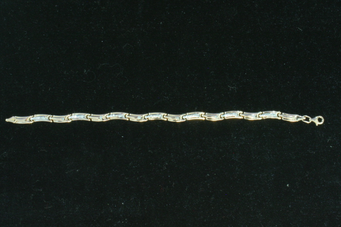 № 59 Браслет с камнями синтетическими. Проба 585 и именник МЮЗ - лазерные, очень высокого качества. Общая масса 12-25,0 гр. Внутрь звеньев закачан металл.