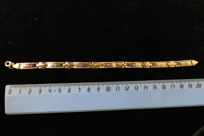 № 60 Браслет с камнями синтетическими. Общая масса 21,40 проба импортная 585 и лазерная российская апробация. Внутри звеньев закачан металл.