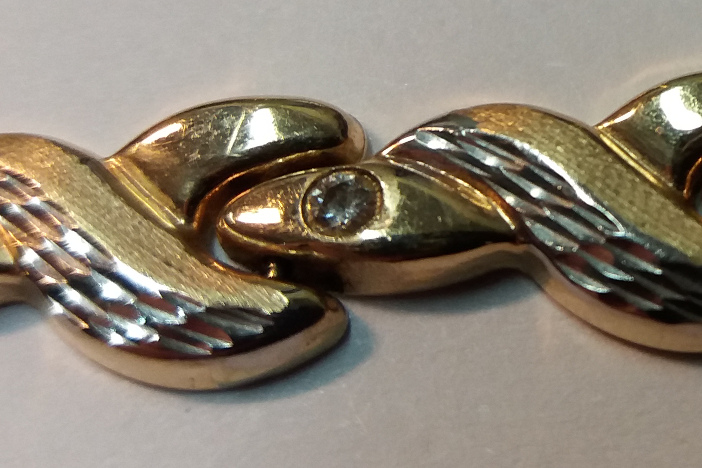 любой даже бриллиант плохого качества). Просверлены отверстия, залито металлом. Проба 585 импортная, наш именник МЮЗ и наша проба Московской